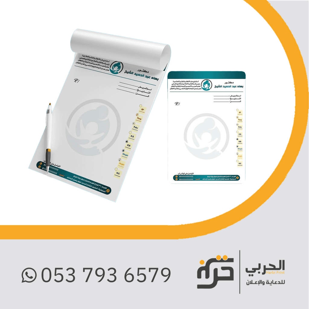 بجودة عالية وبأحجام متعددة لتناسب احتياجات الأطباء والصيدليات، مع إمكانية تخصيص التصميم لإضافة الشعار أو البيانات الخاصة بالمؤسسة.
